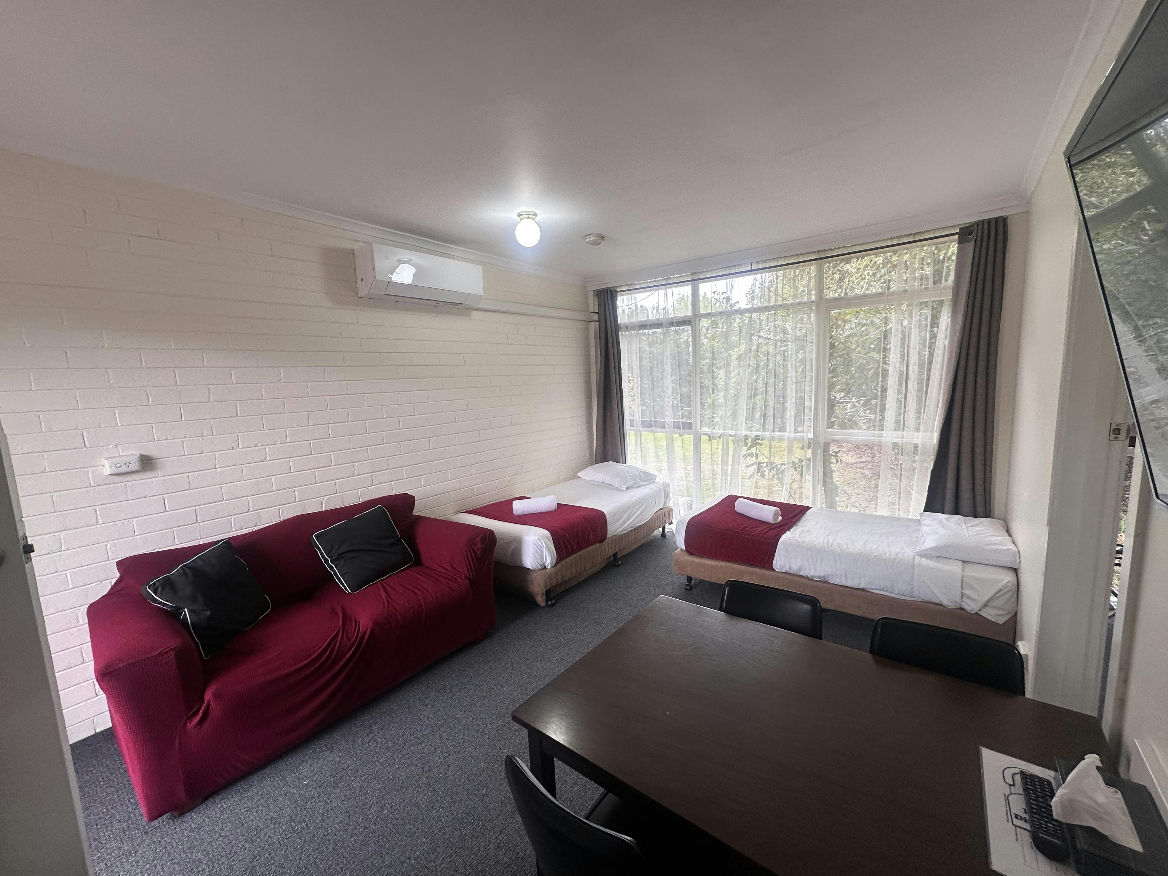 Our spacious Family Room at Motel Traralgon is designed with comfort and convenience in mind. Ideal for families or small groups, the room features a combination of queen and single beds, a private bathroom, and a cozy sitting area.